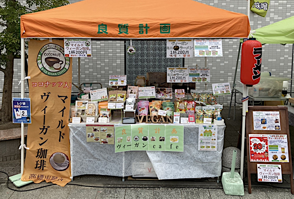 - マイルドヴィーガン珈琲・ヴィーガンクッキー・お団子・ヴィーガン防災パン・ヴィーガンラーメン・みかんチップス・しいたけチップス・柚子胡椒・出汁等