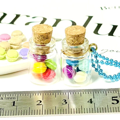お好きな色のマカロンを選んで瓶に詰めかわいいボトルを作ります。キーホルダーやストラップに加工もできます。金具を付ければご自身のアクセサリーにお使いいただいたり、ドール用のチャームとしてもお使いいただけます。